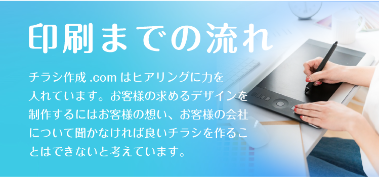 千葉チラシ作成.comでは、お客様の思いを形にするため、ヒアリングに力をいれております。何を伝えていいかわからないという方も多いかと思いますが、好きな色、思い、こんなことをしたいなど、ざっくりとしたイメージで構いませんので、担当スタッフにお伝えください。それを形にするのがプロの私たちの仕事ですので、安心してお任せしていただければと思います。