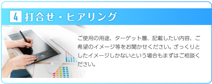 千葉チラシ作成.comでは、お客様の思いを形にするため、ヒアリングに力をいれております。何を伝えていいかわからないという方も多いかと思いますが、好きな色、思い、こんなことをしたいなど、ざっくりとしたイメージで構いませんので、担当スタッフにお伝えください。それを形にするのがプロの私たちの仕事ですので、安心してお任せしていただければと思います。